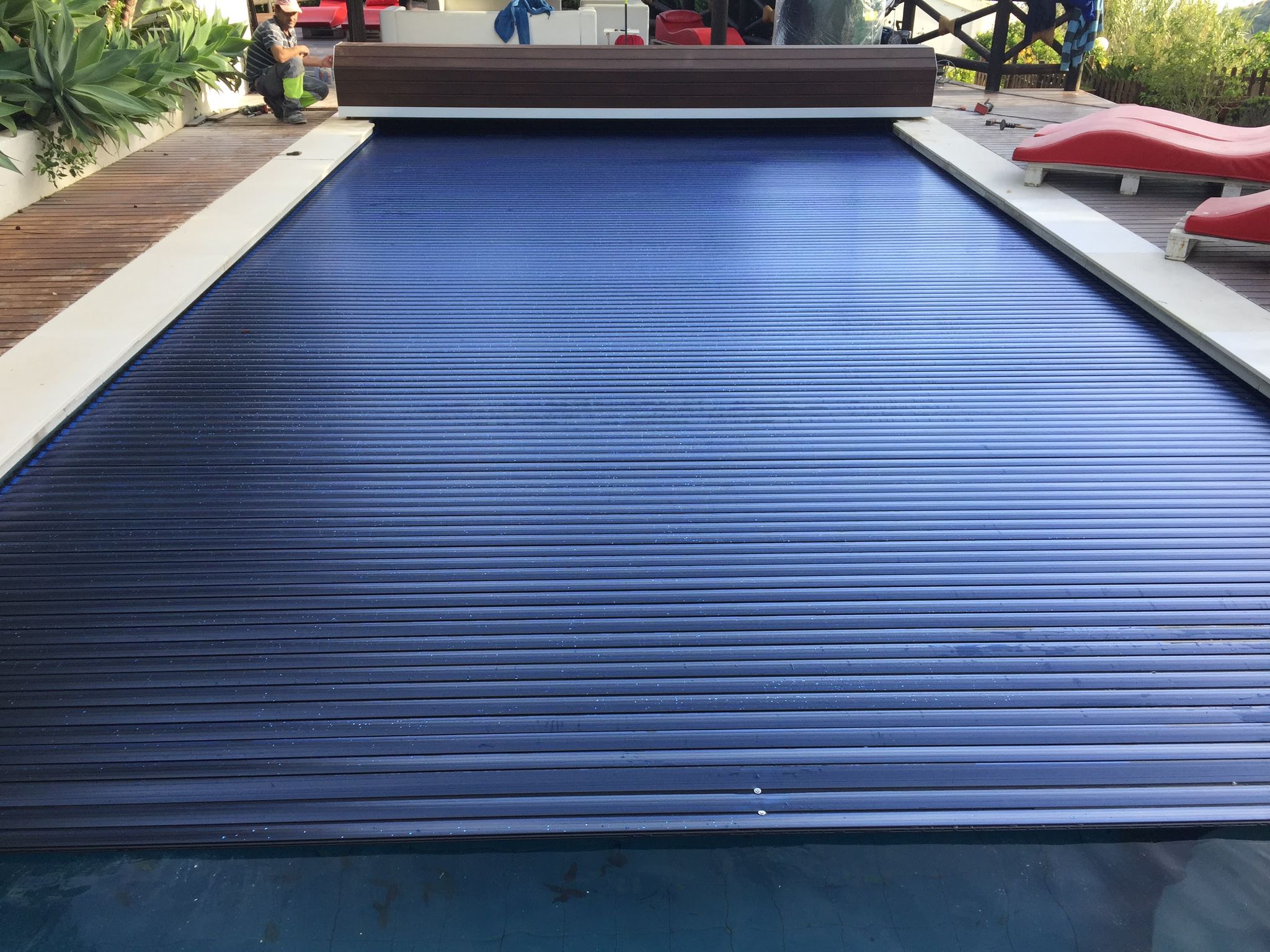 Si tu piscina ya está construida, no te preocupes, se puede instalar una cubierta de lamas con el mecanismo exterior, sin obras ni invasión del vaso de la piscina, aprovechando al máximo la capacidad del mismo. Añadir que con este sistema puedes mantener la temperatura del agua, además de ahorrar en productos de limpieza.